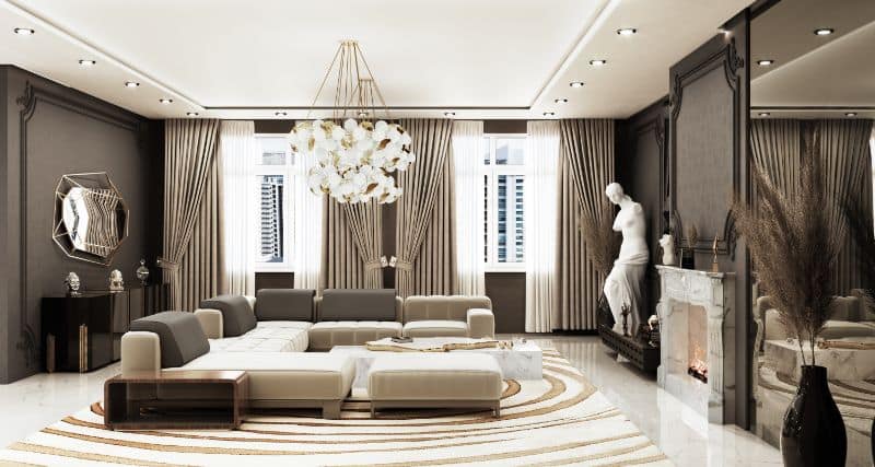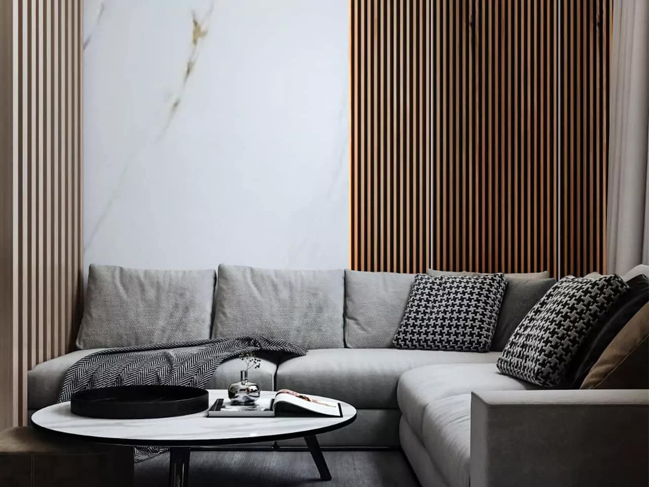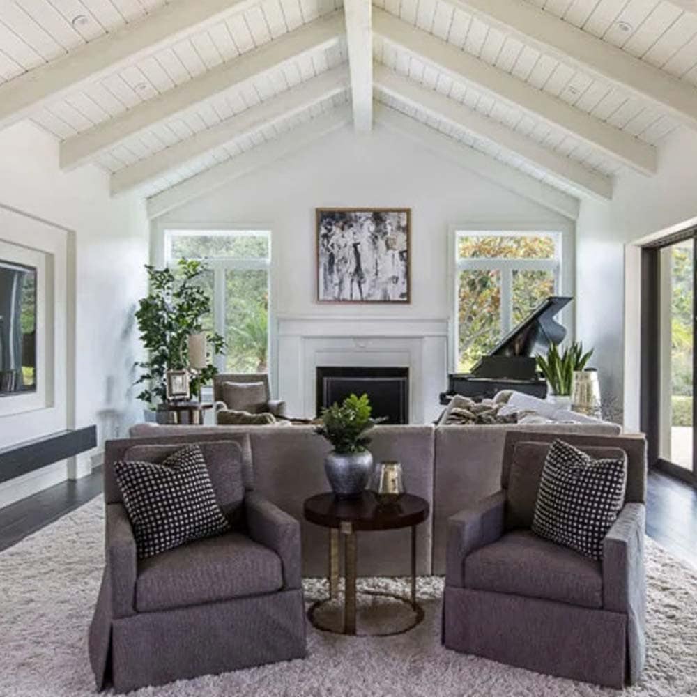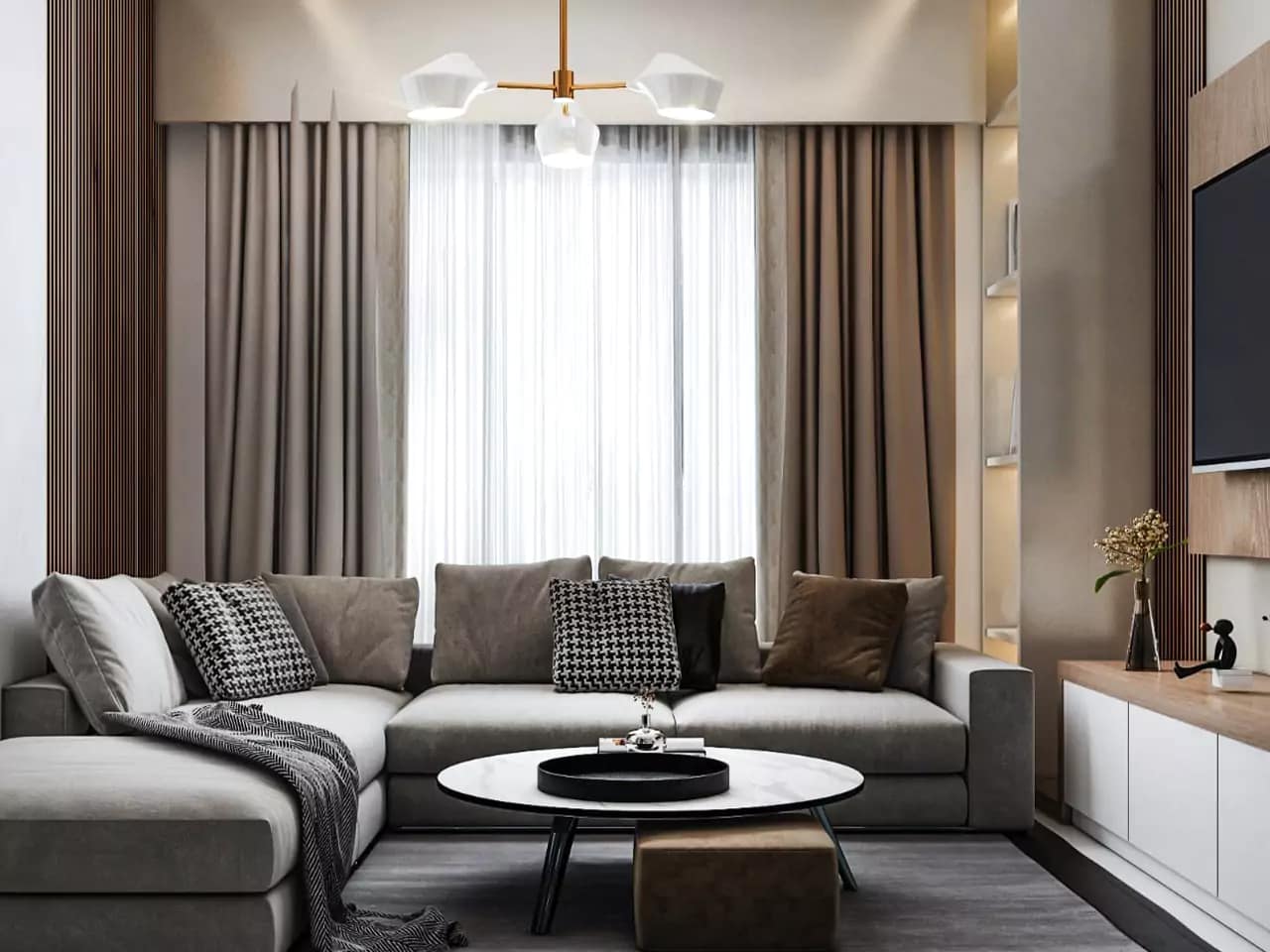 This inviting living room is a harmonious blend of modern design and elegant comfort. The sleek lines and minimalist aesthetic of the furniture are softened by the warm tones and plush textures of the fabrics.